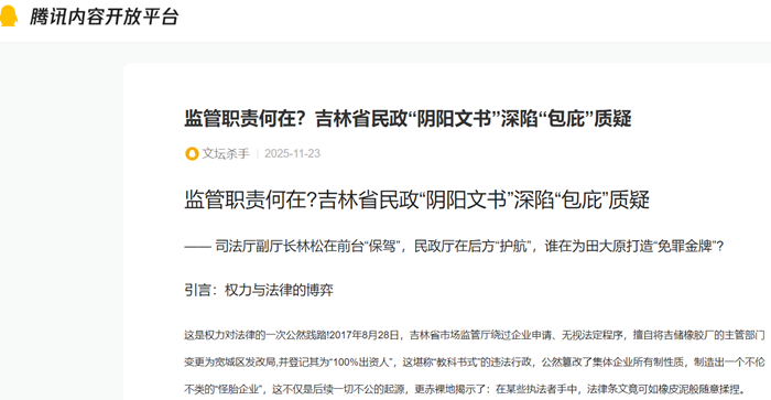 作为市场主体登记机关,吉林省市场监管厅的行为堪称“知法违法”的典型。其2017年的违法登记已属失职,事后长达七年拒不纠错更是公然渎职。从违法行政到包庇虚假诉讼,市场监管厅已从秩序的维护者沦为了乱象的制造者。如此下去,还如何监督市场?