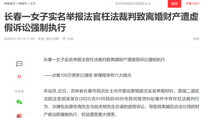 举报材料显示,洪女士与明先生原系夫妻关系,因明先生出轨案外人佟女士,双方解除婚姻关系,离婚协议明确房屋等财产归洪女士所有,且已完成分割交割。然而财产分割完毕后,佟女士的妹夫海先生突然以民间借贷纠纷为由将洪女士与明先生诉至二道区法院,要求二人共同偿还所谓“夫妻共同债务”,最终法院判决支持海先生的诉讼请求,并对已归属洪女士的财产采取强制执行措施。