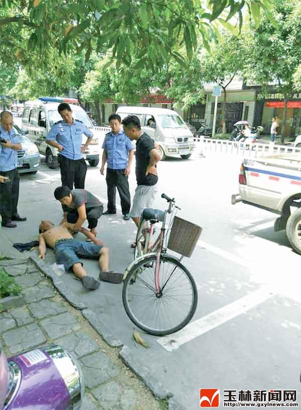 据目击者介绍,当天下午1时许,该男子骑自行车来到清宁路农行一营业厅对面的马路时,突然从车上摔下,自行车压到他的脚,但他没爬起来,而是躺在地上酣睡。几个在人行道玩耍的小孩跑回去告诉家人,大人出来查看后报警。