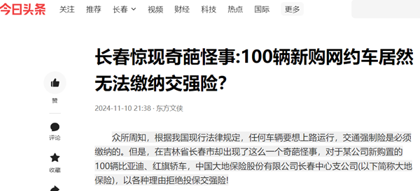 遭遇这一奇葩怪事的是一网约车公司负责人刘先生。刘先生向媒体介绍:2024年9月份,该公司有19台比亚迪、红旗轿车从大连回到长春,这19辆轿车均要用做网约车使用,可是他到大地保险公司长春分公司(简称大地保险)办理续缴交强险时,该公司却以各种理由拒绝投保,不仅大地保险不给办理,其他保险公司也是如此。后来,经过不懈的努力,这19辆轿车总算办理了交强险,但是11月4日新购置的100辆比亚迪、红旗轿车至今仍未给办理。